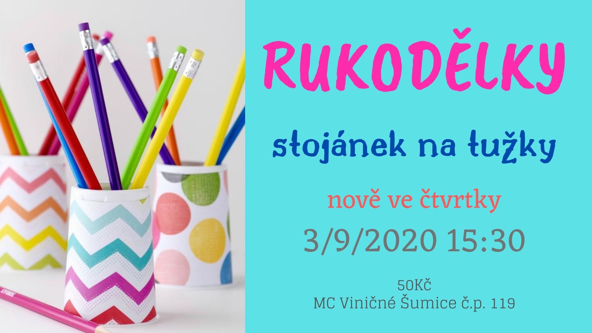 3.9.2020 opět rozjíždíme naši kreativní mysl a zapojení šikovných ručiček - to jsou Rukodělky. Vhodné pro malé, střední i velké :-D