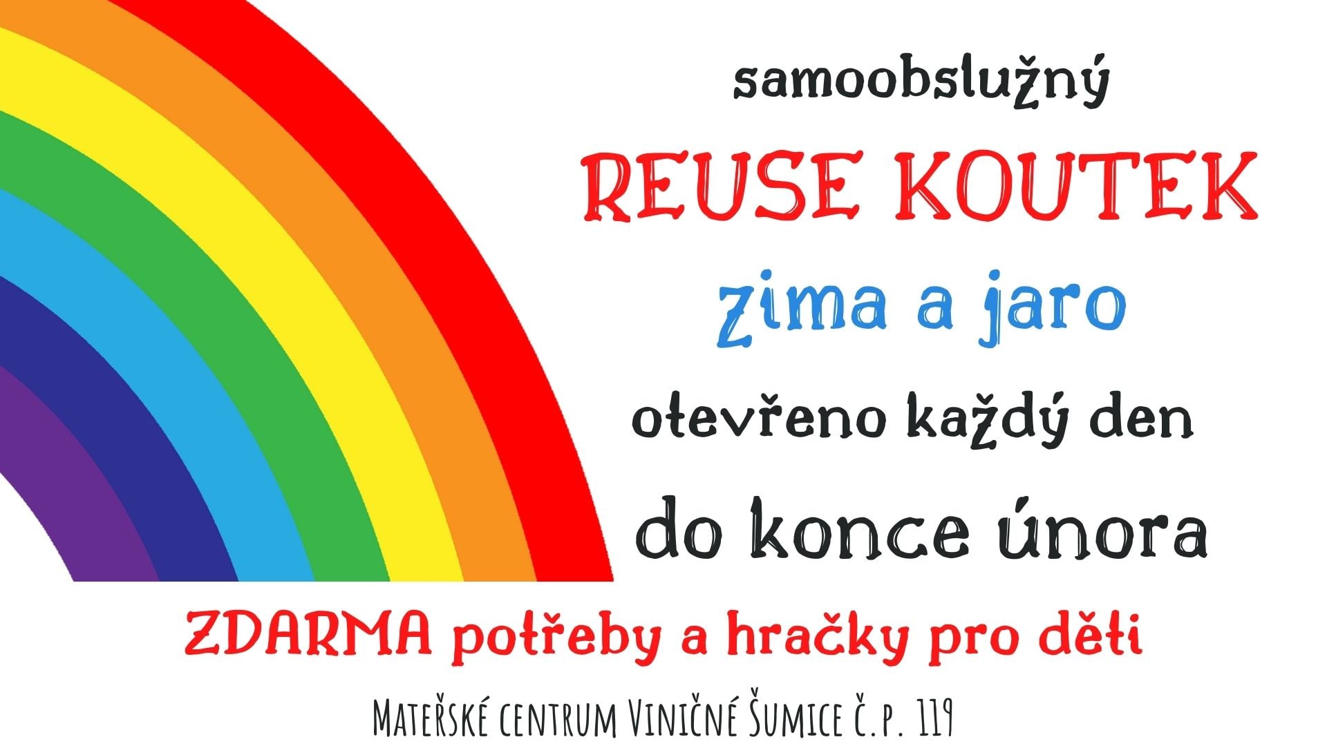 My čekali jaro a zatím přišel mráz...... nenene, teplo bude Také už třídíte oblečení ve skříních a zjišťujete, že děti vyrostly? Pokud děláte jarní pořádky a víte, že by oblečení, potřeby pro děti, hračky, materiál na tvoření aj. našli ještě využití, tak využijte jarní dvoutýdenní reuse koutek. Otevřené prostory pro ukládání a možnost rozebrání...